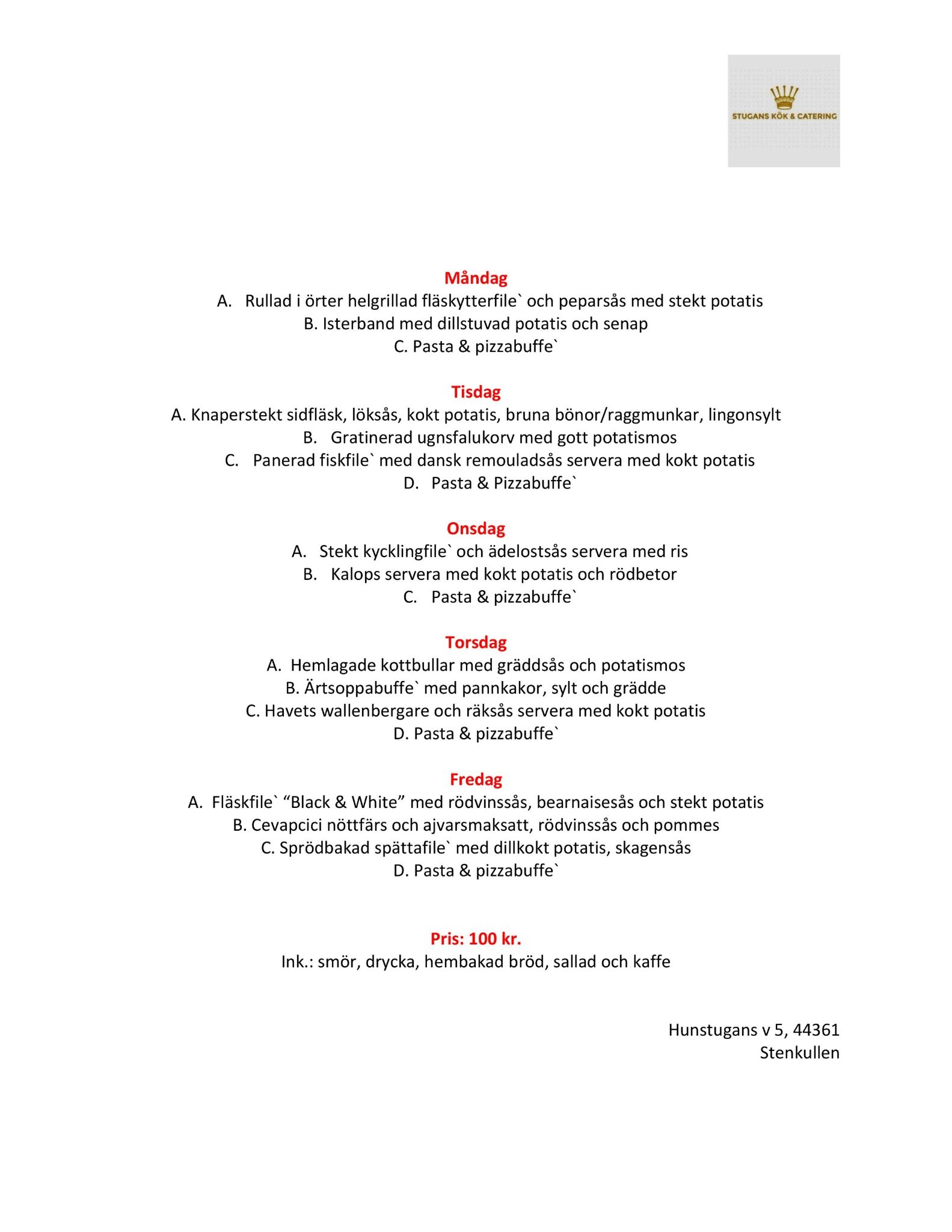 Utöver dagens tips har Stugans Kök en bred meny som täcker: